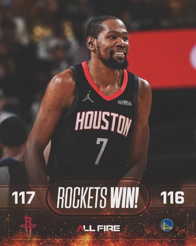 最终火箭在客场117-116险胜勇士,豪取六连胜,创造本赛季最长连胜纪录。